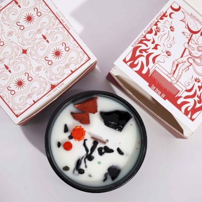 Step into the mystical world with Hop Hare Crystal Magic Flower Candle - The Devil, crafted with Red Jasper & Black Agate with the addition of dry flowers. Each candle comes with a tarot card, unveiling a captivating story within the energising embrace of Blooming Inferno. Immerse yourself in the magic of transformation and botanical elegance with this enchanting candle. FRAGRANCE NOTES: Top notes: Bergamot, Lemon Grass Heart notes: Ylang Ylang, Neroli Base notes: Patchouli, Sandalwood, Vanilla Burning Time : 22 Hours Each candle tells its own story, which you can read on the candle box.
