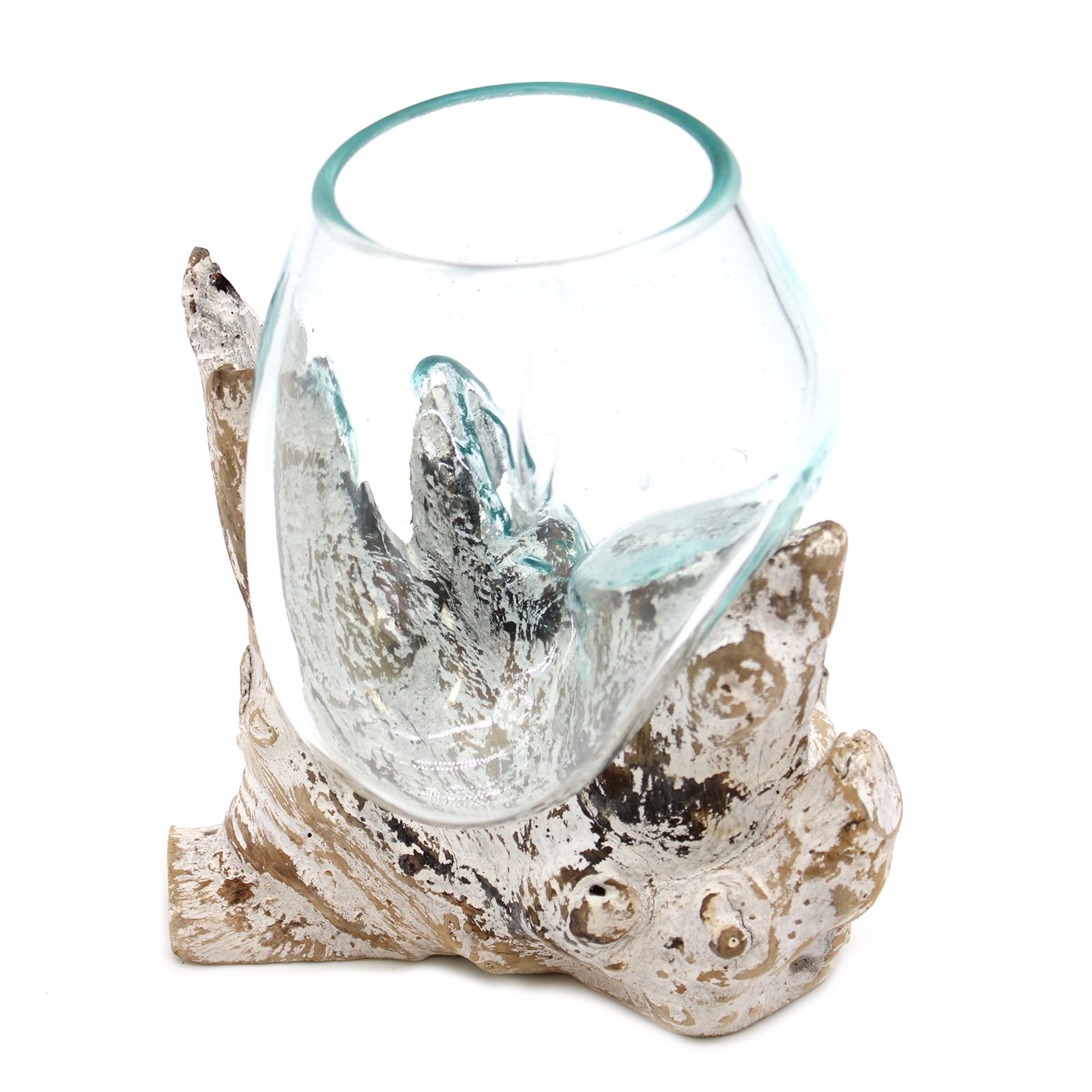 Handmade Melted Glass on Wood is finally here. Probably the biggest thing out of Bali in years, in Holland already a massive trend. Everything house plant related and natural is a major trend, and this beautiful and natural product is right on the button. They are crafted by hand in Bali from recycled glass and Balinese Gamal wood. This stunning, molten art glass vase brings the best of two worlds together: natural and man-made; earthy and chic; practical and spiritual. The glass is hand-blown and while still hot it is then relaxed over a piece of Gamal root, the glass then hardens to the shape of the wood ensuring a perfect fit. They are crafted using a natural product by using hand tools in the traditional Balinese way. Each item is unique as they are made from natural sustainable Gamal wood and the recycled glass is shaped to suit which add to its authenticity.They can be used for house plants, zen gardens or floating candles. Please note: That due to the handmade nature of this product, there can be small imperfections in the glass such as small bubbles, light scratches. Sizes and designs may vary slightly.