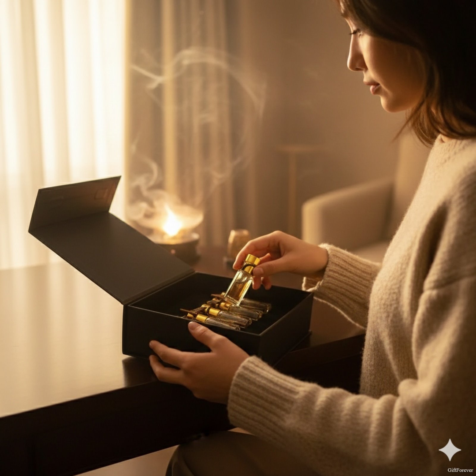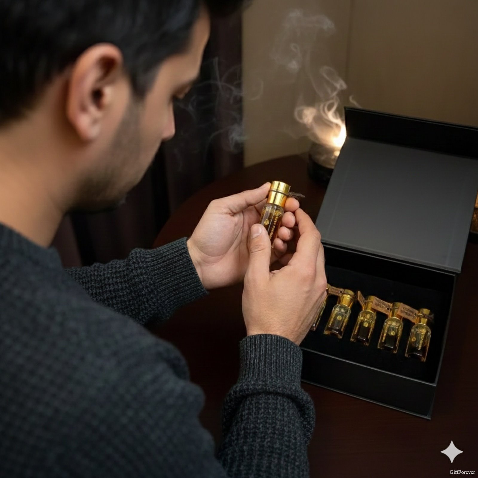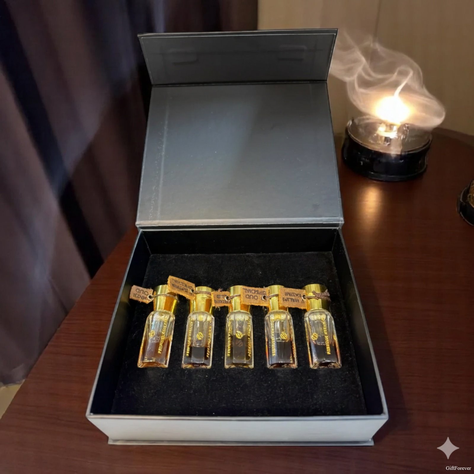 Craft Your Signature Scent: The Luxury Oud Gift Box – (5 x 3ml) Embark on an unparalleled journey into the heart of oud with our exclusive Luxury Oud Gift Box. This exquisite set invites you to become the artisan of your own fragrance destiny, with five distinct and precious 3ml oud oils from our connoisseur collection. Presented in a sophisticated gift box, this is the ultimate indulgence for oud enthusiasts and a magnificent introduction to the world most revered natural perfume ingredient. The Art of Layering or Solo Splendor: Each 3ml bottle contains 100% pure oud oil, perfect for applying directly to the skin for an enduring personal scent, or for artfully layering to create a custom fragrance that is uniquely yours. A Gift of Unrivalled Sophistication: Presented in a sleek and elegant gift box, the Luxury Oud Gift Box is more than just a present; it is an experience. Ideal for special occasions, or as a distinguished treat for yourself, it promises an authentic journey into the world's most treasured fragrance. Unlock the mystique of oud – crafted specially for you and your loved ones.