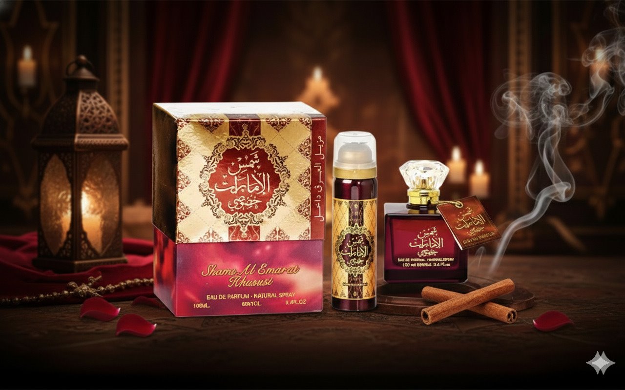 A Journey Through Exquisite Notes: Vibrant Top Notes: The scent opens with a lively and inviting burst of juicy tangerine and crisp apple, beautifully softened by a hint of creamy vanilla. This initial accord is both refreshing and subtly sweet. Warm & Spicy Heart Notes: As the fragrance develops, it reveals a captivating heart where delicate roses intertwine with a rich layer of vanilla and a medley of warm spices. The exotic touch of ylang-ylang adds a creamy, floral depth, enhancing its luxurious character. Irresistible Woody Base Notes: The journey culminates in a profound and enduring base, where precious oud, clean white musk, creamy sandalwood, and earthy patchouli create a harmonious blend. This woody foundation provides remarkable depth and an irresistible, long-lasting trail. Shams Al Emarat Khususi is more than just a perfume; it's an invitation to experience opulence and tradition. Let its unique blend transport you to an Arabian night, leaving a mesmerising essence wherever you go. Shams Al Emarat Khususi: Embrace Your Irresistible Aura.