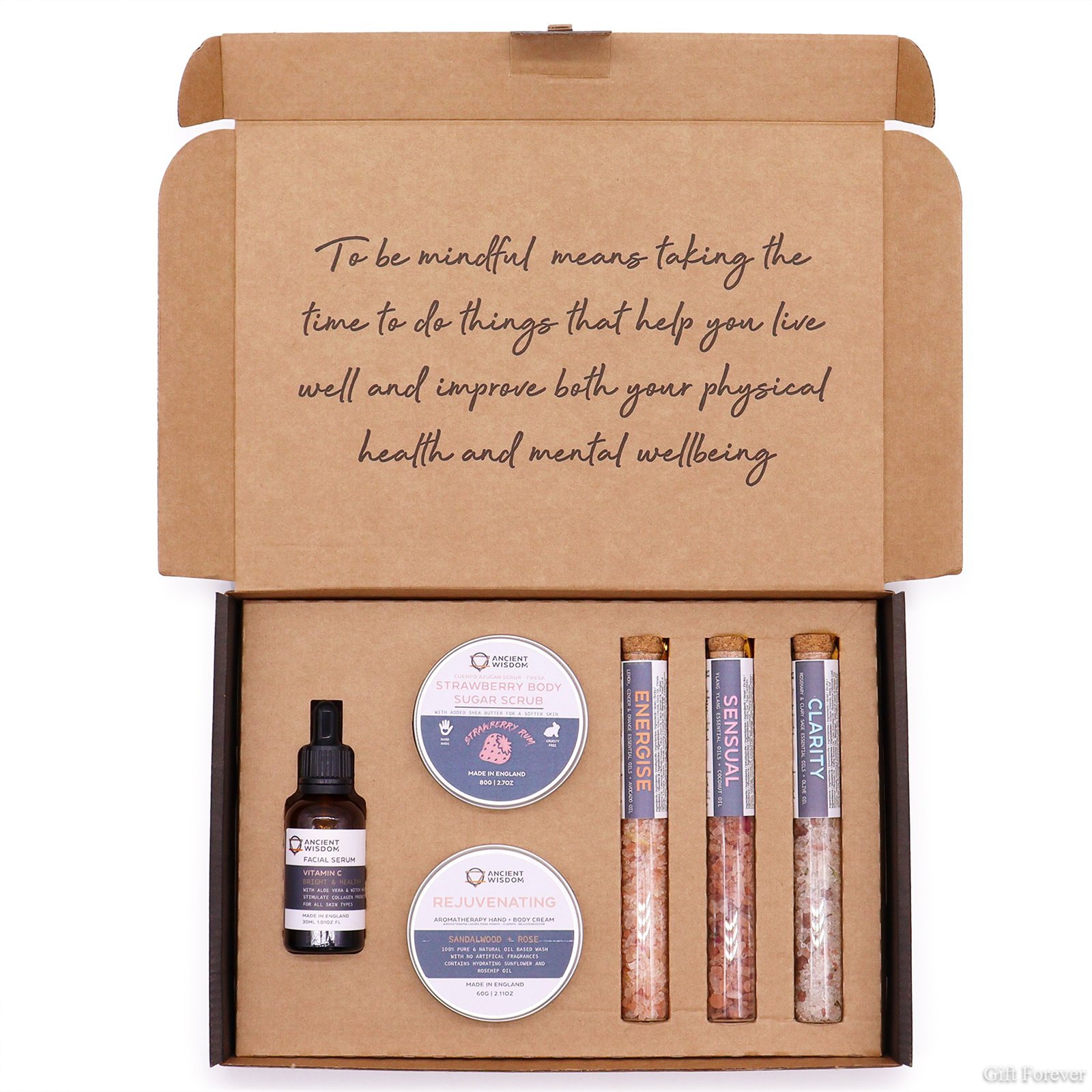 Serenity Essential Self-Care Kit is a perfect blend of indulgence and rejuvenation. This thoughtfully curated set includes a collection of luxurious products designed to nourish the body and invigorate the senses. Embark on a blissful journey of self-care with your Serenity Essential Self Care Kit. This set includes: ** Invigorating scrub ( 80g ) that combines the exfoliating power of sugar with the enticing scent of fresh strawberries, ** Rejuvenating body cream ( 60g ), infused with carefully selected ingredients, ** Trio of bath salts in vials ( 3 x 40g ): energise, clarity and sensual, ** Vitamin C serum ( 30ml ), packed with potent antioxidants. Whether you are seeking a moment of relaxation or looking to revitalize their bodies and minds, this kit is the perfect companion. Perfect as a gift for someone special. Order your Serenity Essential Self-Care Kit today and embark on a journey of indulgence and well-being. Box size: 28 x 19 x 3.8 cm