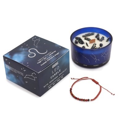 Unleash the bold and radiant energy of Leo with this Zodiac Crystal Candle. The warm, invigorating fragrance of Frosted Citrine and Ginger fills the air, perfectly matching the vibrant and confident spirit of this fire sign. The set includes a powerful gemstone bracelet made with tiger's eye and carnelian, carefully selected to amplify Leo’s strengths: Tiger’s eye enhances courage and personal power Carnelian boosts creativity and motivation This bold pairing of candle and bracelet is perfect for empowering the Leo within, making it an ideal gift or a personal addition to the self-care ritual. Top notes: Nectarine, Citrus, Green NotesHeart notes: Rose Petals, Muguet, GingerBase notes: Musk, Woods
